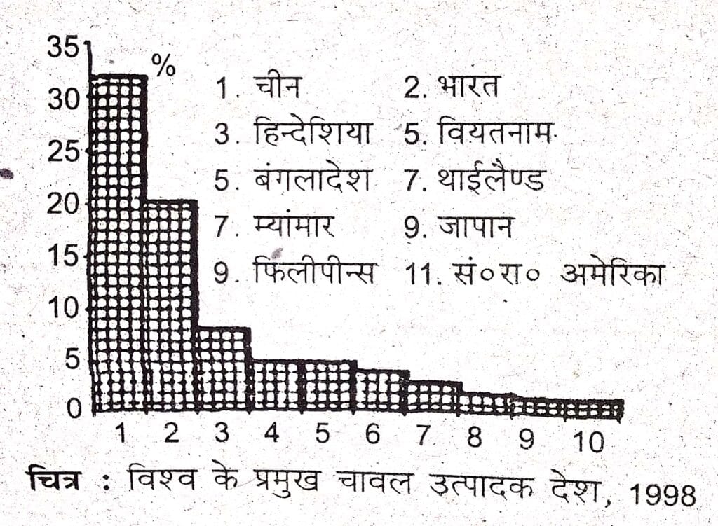 (2) भारत : भारत विश्व का दूसरा बड़ा चावल उत्पादक देश है, जो विश्व का लगभग 20 प्रतिशत चावल उत्पादन करता है। भारत में चावल का प्रति हेक्टेयर उत्पादन कम है। भारत में चावल की खेती मुख्य रूप से गंगा के मैदान, ब्रह्मपुत्र घाटी तथा समुद्र तटवर्ती भागों में की जाती है । उत्पादन की दृष्टि से प० बंगाल, आन्ध्र प्रदेश, तमिलनाडु, उ०पू० उड़ीसा, म०प० असम, पंजाब, कर्नाटक, महाराष्ट्र, हरियाणा, गुजरात, जम्मू-कश्मीर, केर आदि प्रमुख राज्य हैं। भारत में चावल खरीफ की मुख्य फसल है। 1986 में यहाँ 910 लाख मी० टन चावल का उत्पादन किया गया था।