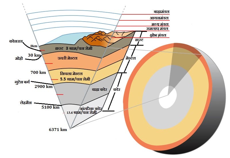 निष्कर्षत:- पृथ्वी की आंतरिक संरचना अनेक स्तरों में विभाजित है, जो एक-दूसरे से रासायनिक एवं भौतिक गुणों में भिन्न हैं। यह संरचना न केवल पृथ्वी की उत्पत्ति और विकास को समझने में सहायक है, बल्कि भूकंप, ज्वालामुखी और अन्य भूगर्भीय घटनाओं को भी स्पष्ट करने में महत्त्वपूर्ण भूमिका निभाती है।