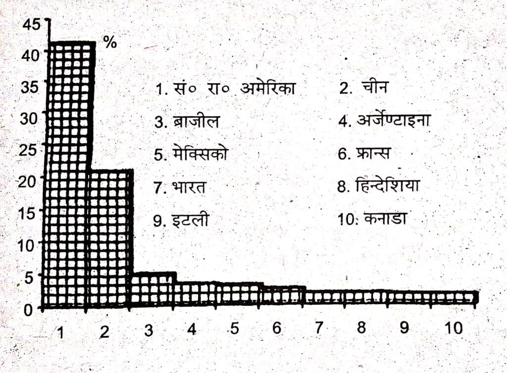 1. सं० रा० अमेरिका 2. चीन 3. बाजील 4. अर्जेण्टाइना 5. मैक्सिको 6. युक्रेन 7. भारत 8. इण्डोनेशिया 9. कनाडा 10. फ्रांस 11. मिस्र 12.दक्षिणी अफ्रीका 13. हंगरी 14. इटली | 1 2 3 4 5 6 7 8 9 10 11 12 13 14 | 10960 5947 4288 7442 3718 6602 2574 5370 9371 8158 7389 3995 6181 10351 | 384.77 231.83 64.14 39.79 28.25 28.07 26.26 20.36 12.34 12.13 8.01 7.77 7.4 6.83 |