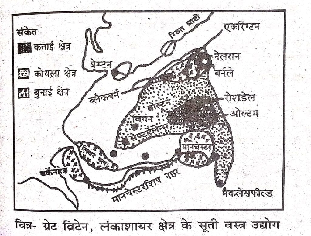 ग्रेट ब्रिटेन (U.K.) : यहाँ औद्योगिक क्रान्ति का सूत्रपात सूती वस्त्र उद्योग से ही हुआ इस उद्योग का ग्रेट ब्रिटेन की अर्थव्यवस्था में महत्त्वपूर्ण स्थान है । इस देश में सूती वस्त्र उद्योग के मुख्य क्षेत्र निम्नांकित है – लंकाशायर क्षेत्र, स्कॉटलैण्ड की कलाइण्ड घाटी में ‘ग्लासगा क्षेत्र’, वेस्ट राइडिंग का ‘ब्रेडफोड क्षेत्र’ एवं डर्बीशायर, यार्कशायर तथा नाटिंघम क्षेत्र ।